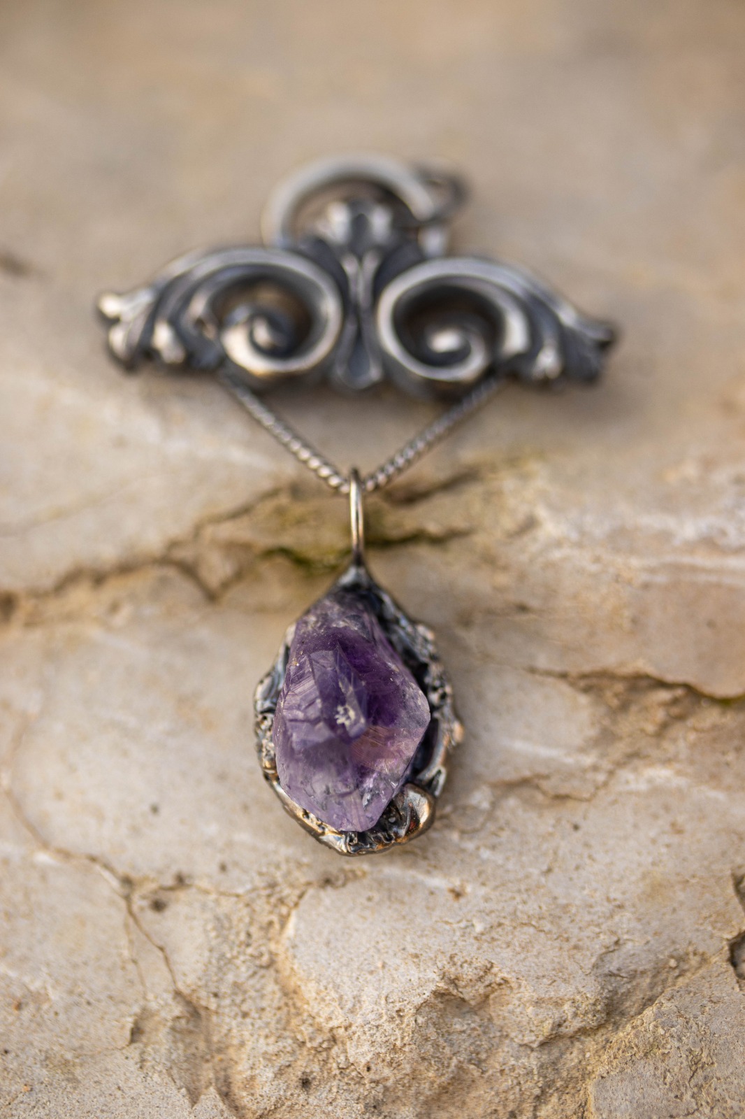 Plata de primera ley y amatista natural en bruto.