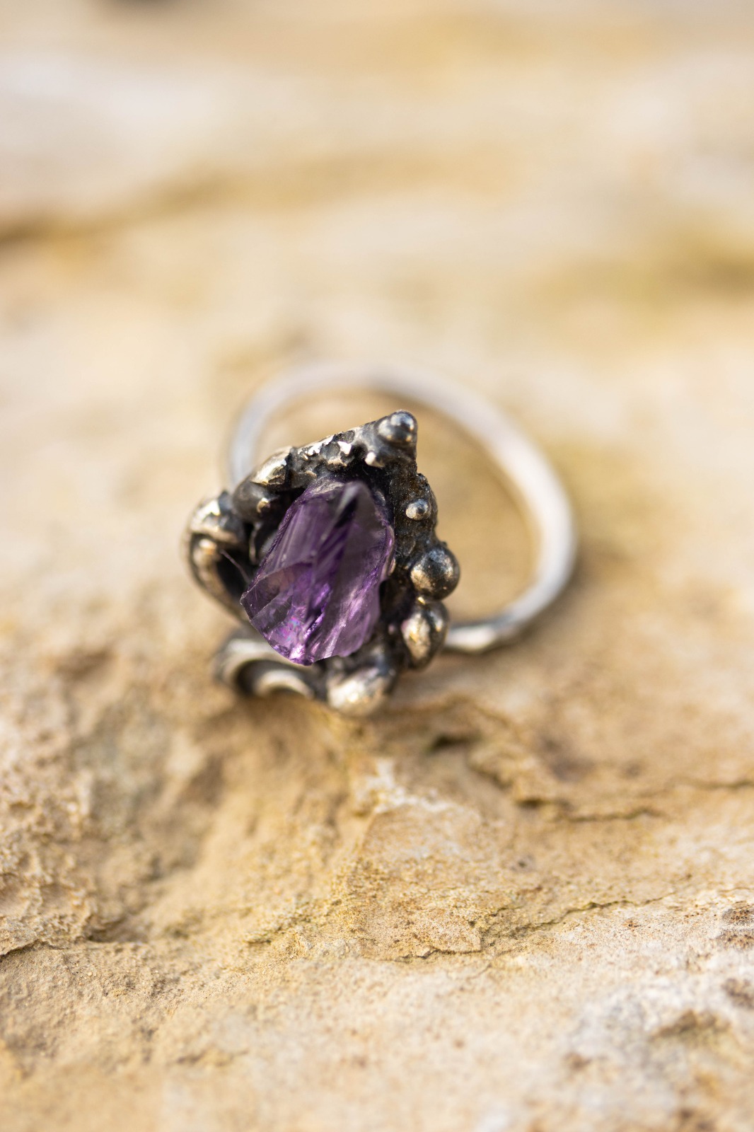 Plata de primera ley y amatista natural en bruto.