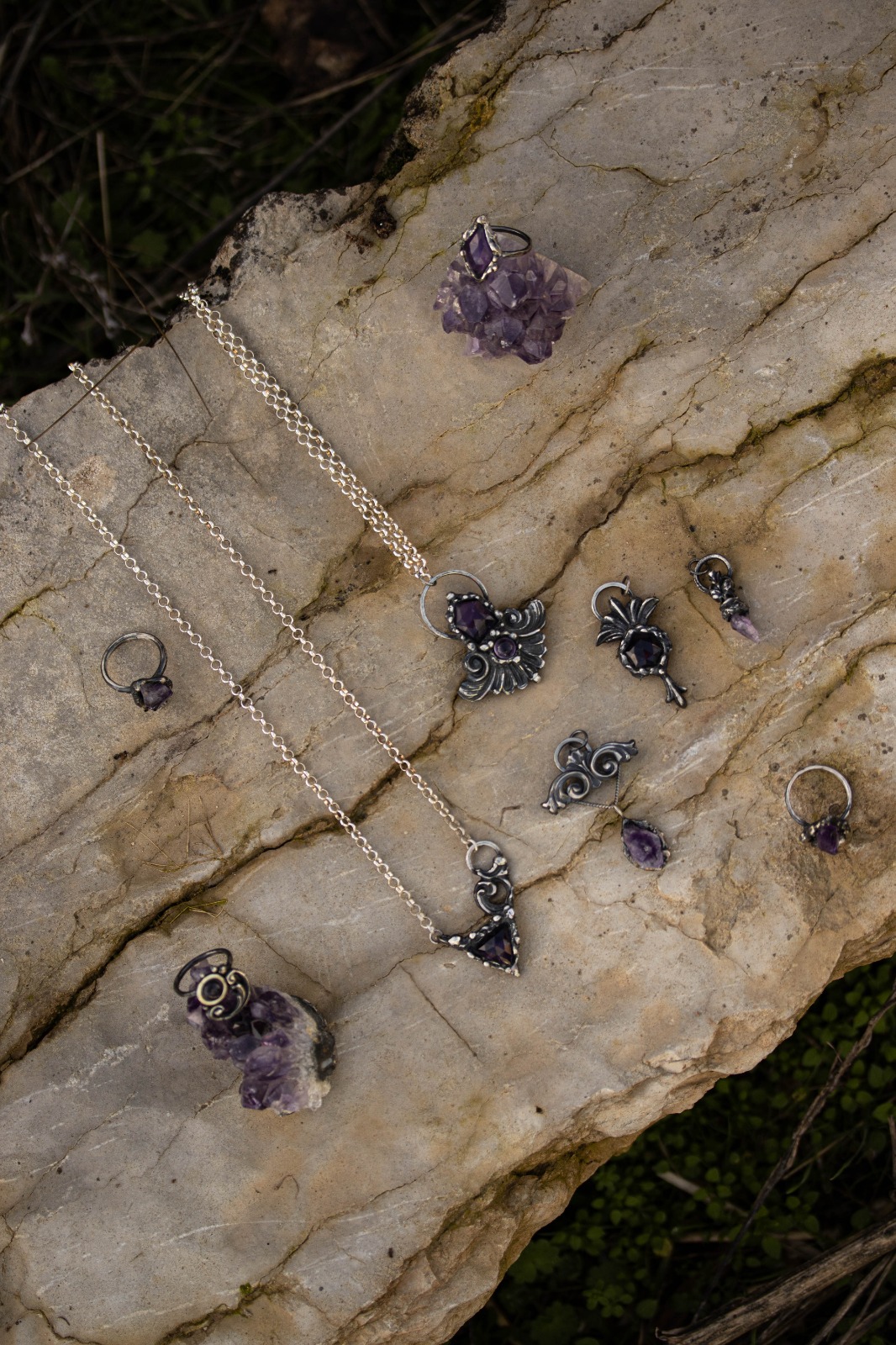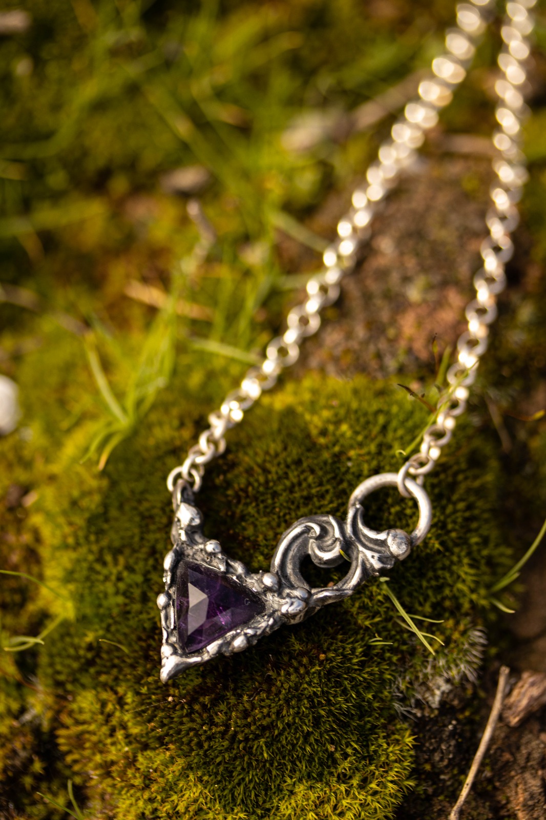 La amatista facetada recoge la luz como si emergiera de la sombra.